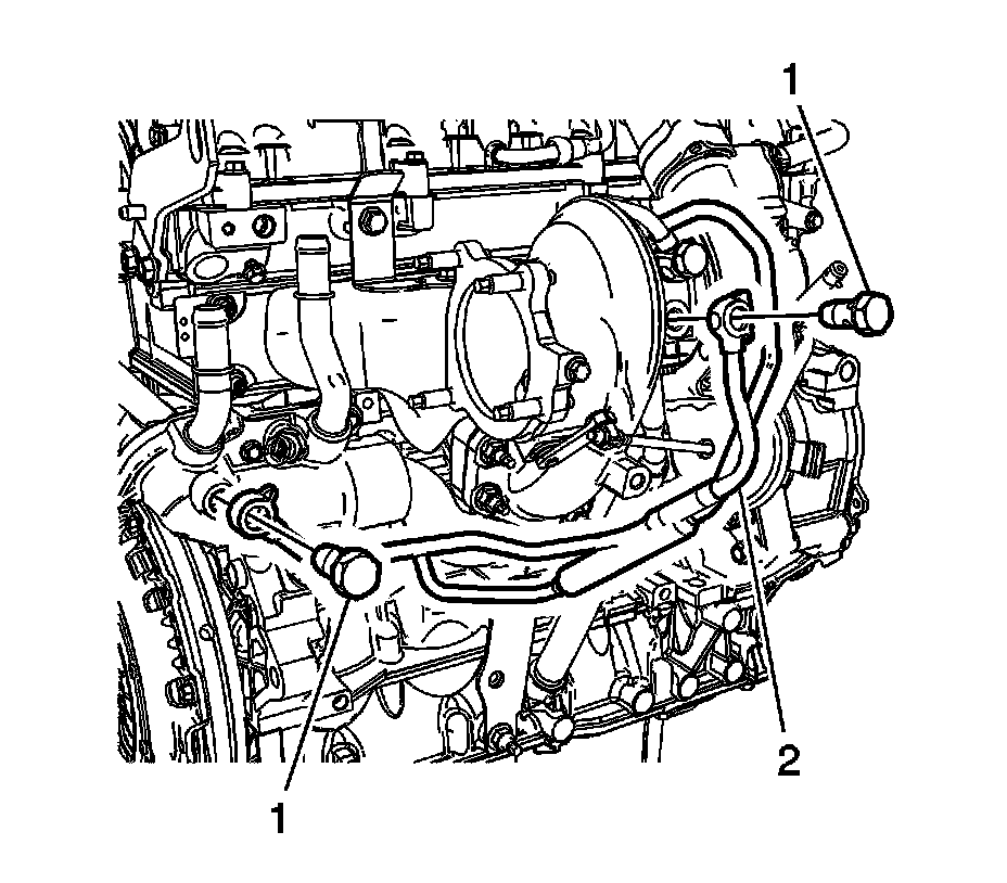 1. Install NEW gaskets to the banjo fittings (1) on the turbocharger coolant return pipe (2).