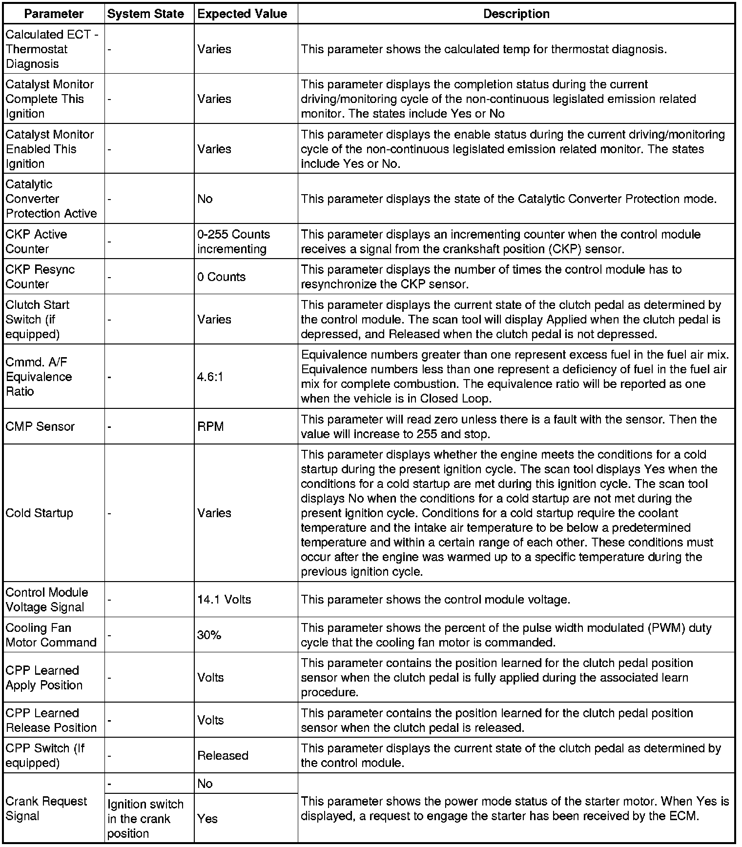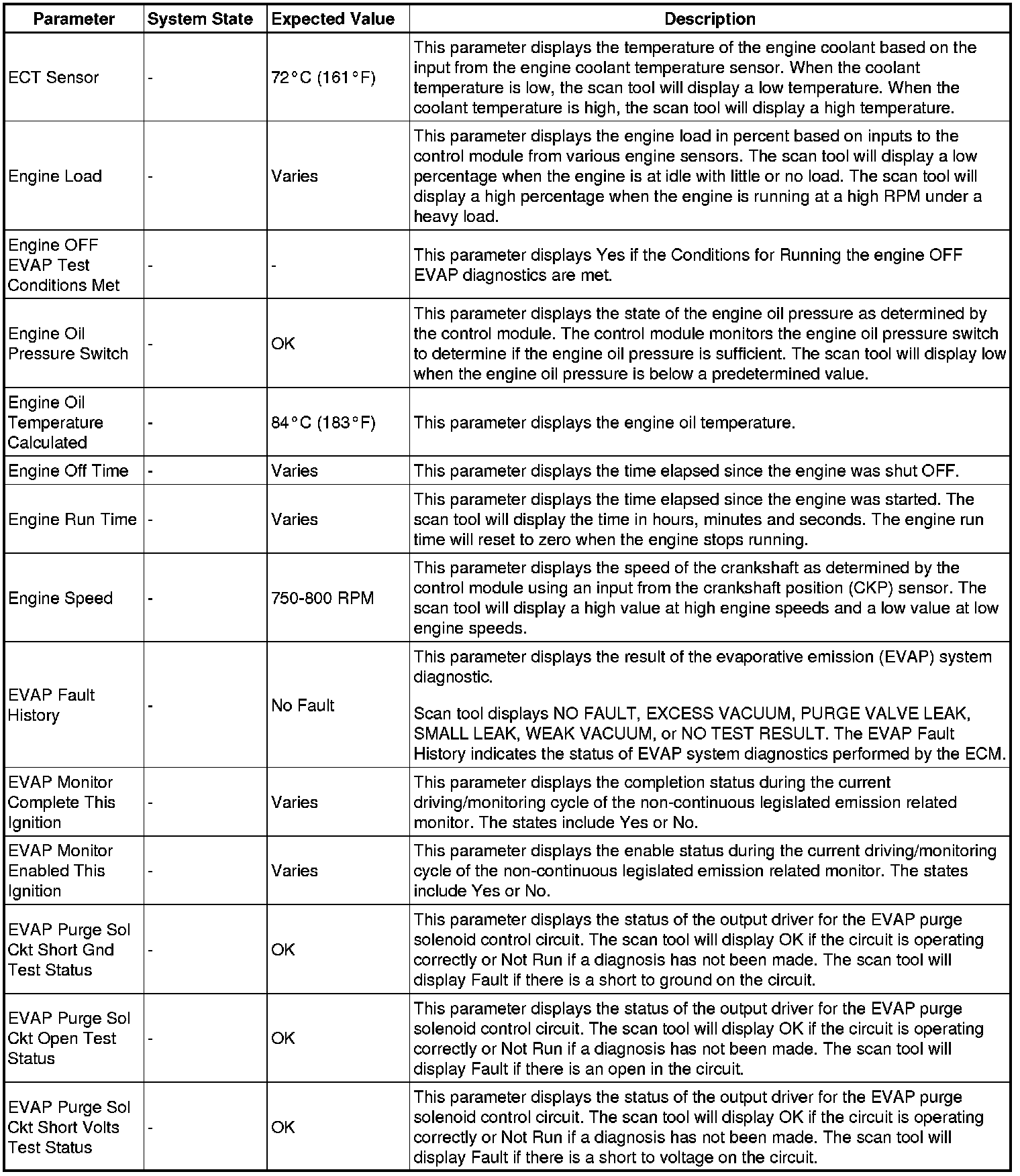 The Engine Control Module Scan Tool Data List contains all engine-related parameters that are available on the scan tool. The list is arranged in alphabetical order. A given parameter may appear in any one of the data lists, and in some cases may appear more than once, or in more than one data list in order to group certain related parameters together.