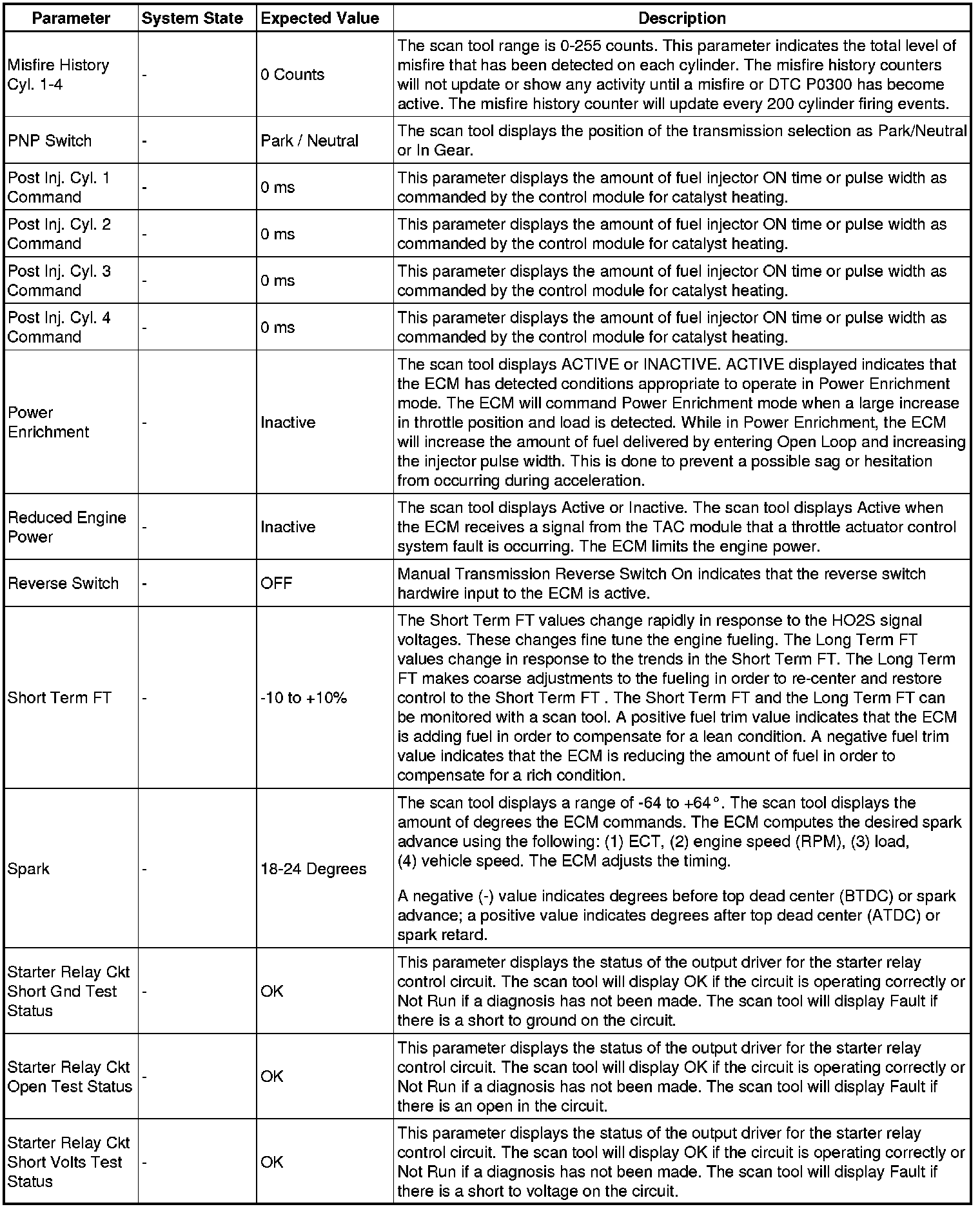 Only the parameters listed below are referenced in this service manual for use in diagnosis. If all values are within the typical range described below, refer to Symptoms - Engine Controls (Symptoms - Engine Controls) for the 2.0L engine for diagnosis.