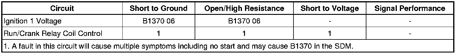 The inflatable restraint sensing and diagnostic module (SDM) monitors the ignition signal from the ignition switch. When the vehicle ignition switch is placed in the RUN or CRANK position, the switch supplies voltage to the SDM ignition input terminal. If an open or short to ground in this SDM ignition circuit is detected, then DTC B1370 will set.