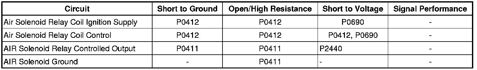 • If the test lamp is always OFF, test the ignition circuit for a short to ground, or an open/high resistance. If the circuit tests normal, replace the Air Solenoid relay.