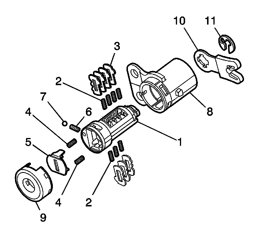 The ignition lock cylinder uses only 7 of the 10 cut positions, 2 through 8. The ignition cylinder tumblers (3) are located on alternate sides of the cylinder (1). They are snap-in and self-retaining. It follows the key code with the first tumbler being the first depth of the key code, closest to the head of the key.