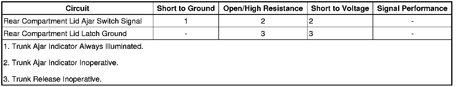 When the ignition is ON, the body control module (BCM) supplies battery positive voltage to the rear compartment lid ajar switch through the rear compartment lid ajar switch signal circuit. When the rear compartment lid is opened, the signal circuit is connected to ground through the rear compartment lid ajar switch ground circuit and the voltage is pulled low within the BCM. In response, the BCM sends a serial data message to the driver information center (DIC) in the instrument panel cluster (IPC) to illuminate the rear compartment lid ajar indicator.
