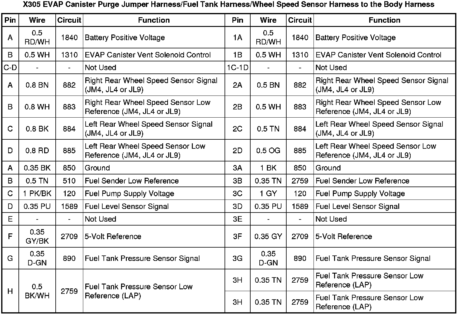 X305 EVAP Canister Purge Jumper Harness/Fuel Tank Harness/Wheel Speed Sensor Harness to the Body Harness