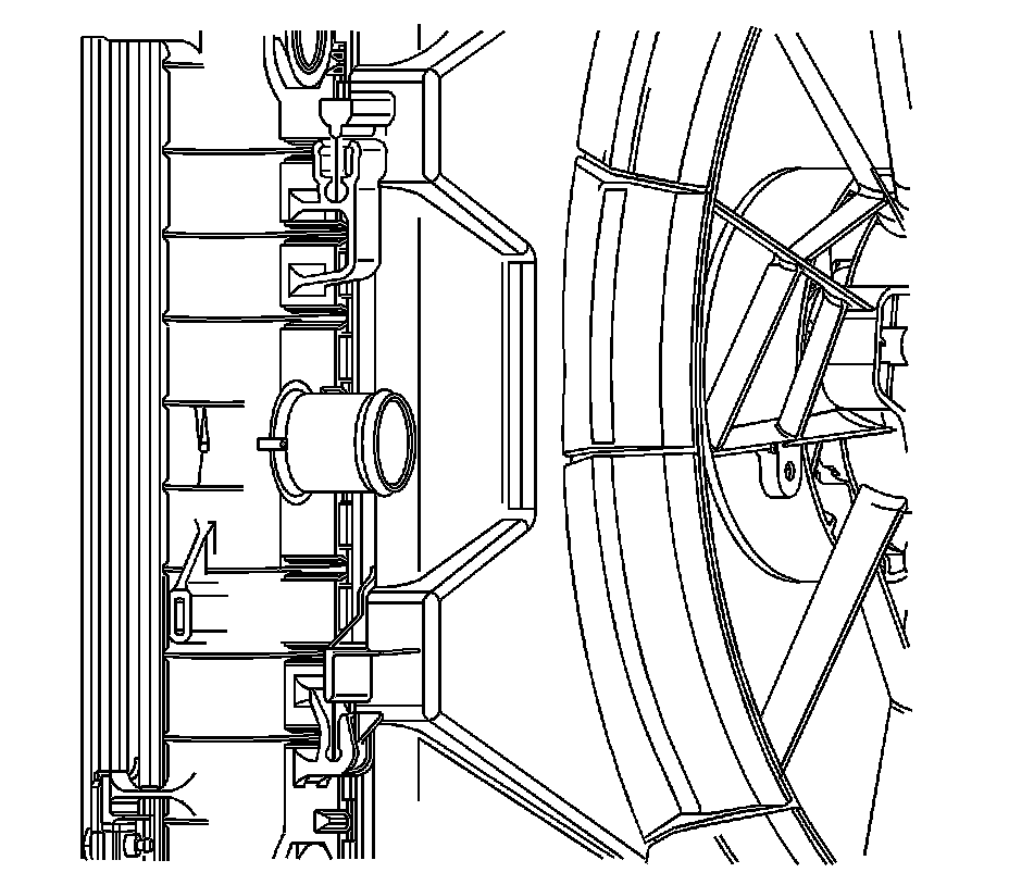 12. Remove the cooling fan assembly from the radiator by pushing up on the fan shroud to unsnap the retaining features. Position the cooling fan assembly away from the radiator and support the cooling fan assembly.