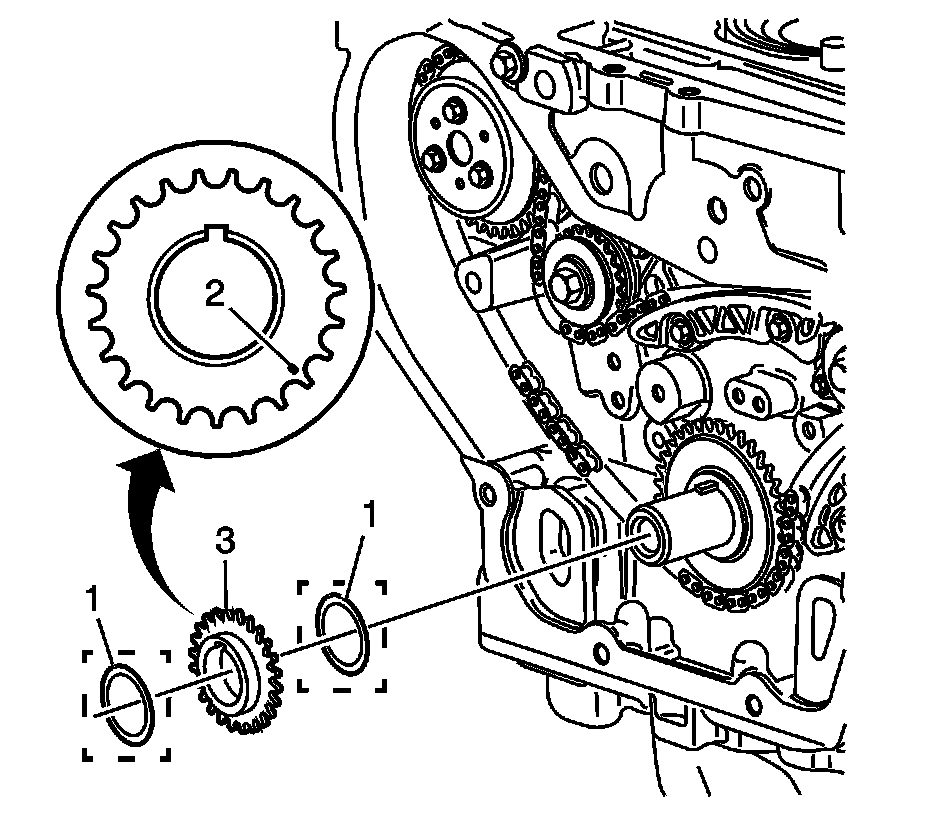 3. Install the timing chain drive sprocket (3) to the crankshaft with the timing mark (2) in the 5 o'clock position and the front of the sprocket facing out.