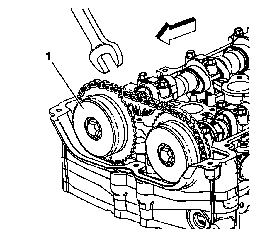 17. Using a 23-24 mm open end wrench, rotate the exhaust camshaft clockwise until the dowel pin in the camshaft actuator goes into the camshaft slot.