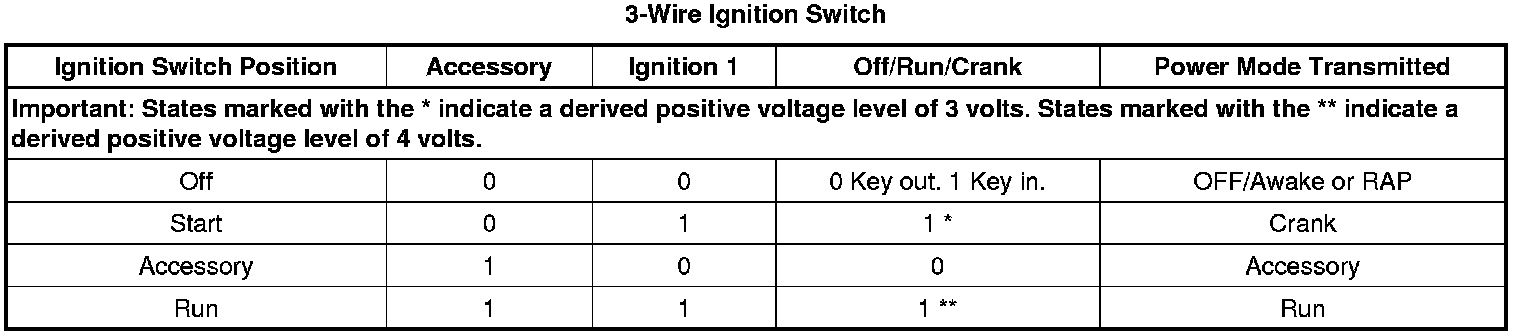 On vehicles that have several control modules connected by serial data circuits, one module is the power mode master (PMM). On this vehicle, the PMM is the body control module (BCM). The PMM receives 3 discrete ignition switch signals to differentiate which power mode will be sent over the Serial Data circuits. The 3-wire Ignition Switch table below illustrates the state of these inputs in correspondence to the ignition switch position: