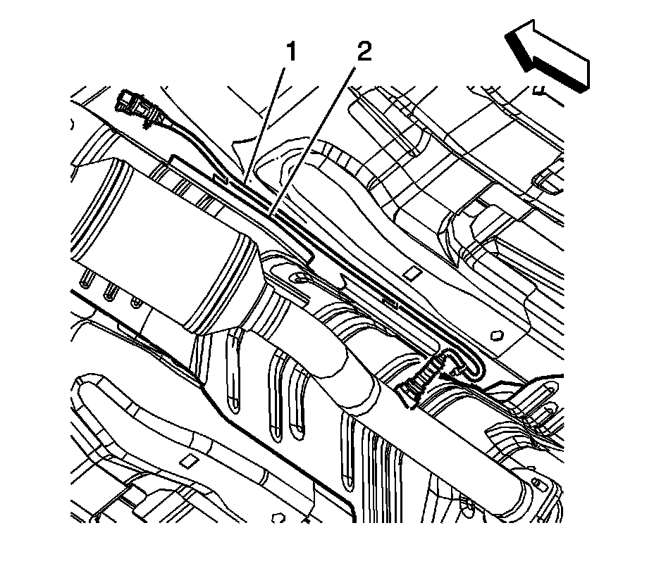 6. Bend the heat shield trough (2) down slightly until the HO2S lead (1) can be removed.