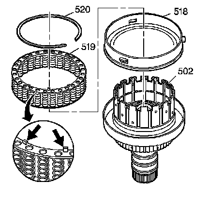 3. Assemble the coast clutch release spring (505) and spring retainer (506) into the input housing (502).