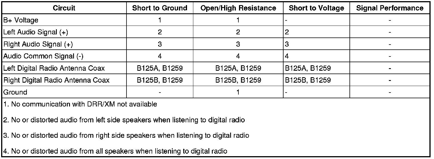 The digital radio receiver (DRR) receives XM satellite radio signals via 2 digital radio antennas located in each of the outside rearview mirrors. The antenna circuits are coaxial cables that carry the digital radio signal information received by the antennas to the DRR. The antenna coax also provides a path for voltage to power the antennas. Separate left and right audio signals (+) are sent from the DRR to the radio. The radio processes these signals and passes them to the audio amplifier.