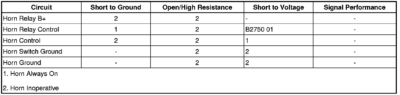 If the test lamp does not illuminate, test the B+ circuit for an open/high resistance. If the circuit fuse is open, test the control circuit terminal C1 for a short to ground. If all circuits test normal, test or replace the HORN relay.