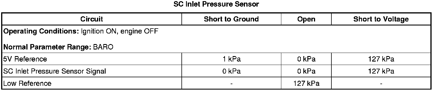 At idle the SC Inlet Pressure parameter represents the calculated difference between BARO and the reduced pressure that is present in the supercharger intake plenum as a positive value. At wide open throttle the SC Inlet Pressure parameter represents the calculated difference between BARO and the increased pressure that is present in the supercharger intake plenum, and should be very close to zero.