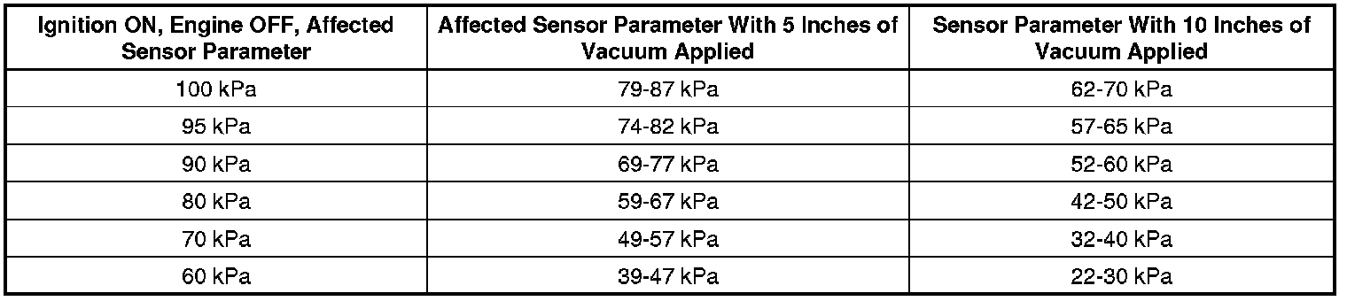 5. Using the J23738-A - Mityvac or the J 35555 - Metal Mityvac to apply 10 in Hg of vacuum to the affected sensor, the parameter in the first column should decrease by 34 kPa. The acceptable range is indicated in the third column.
