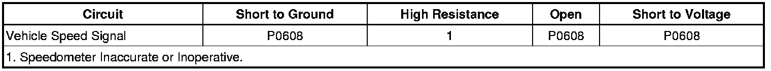 The engine control module (ECM) creates the vehicle speed output signal by pulsing the circuit to ground at a rate of 4KPPM. The vehicle speed sensor (VSS) input is pulled high to B+ in the instrument panel cluster (IPC). The IPC converts the 4KPPM vehicle speed signal to a speedometer position to indicate the vehicle speed. The ECM monitors the voltage at the vehicle speed output signal circuit to determine when the voltage is out of the normal operating range.
