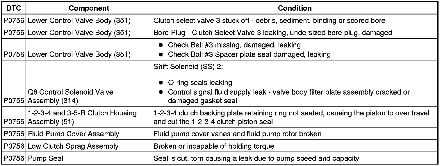 4. Listed in the chart below are conditions for each component that could set DTC P0756. Carefully inspect each component for that condition. Repair or replace as necessary.