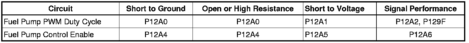 The FPCM provides a control enable input circuit to the FPCM relay to turn the 3-phase fuel pump ON and OFF. The control enable input circuit is switched to ground to turn ON the pump. The FPCM also sends a 400 HZ PWM on a signal circuit to the FPCM relay to control the fuel pump speed by varying the duty cycle of this signal.