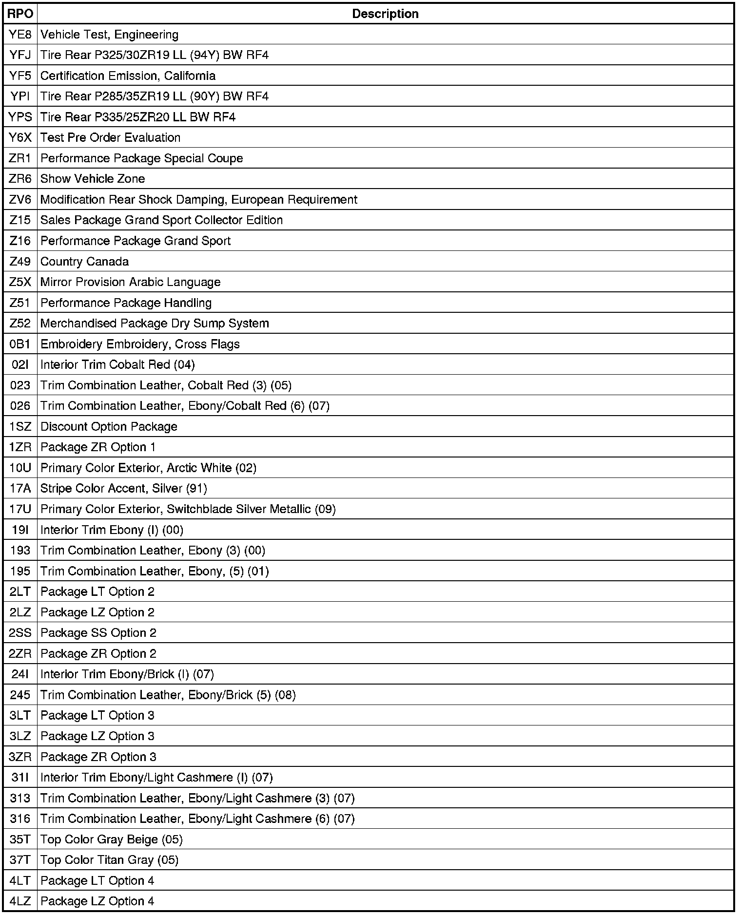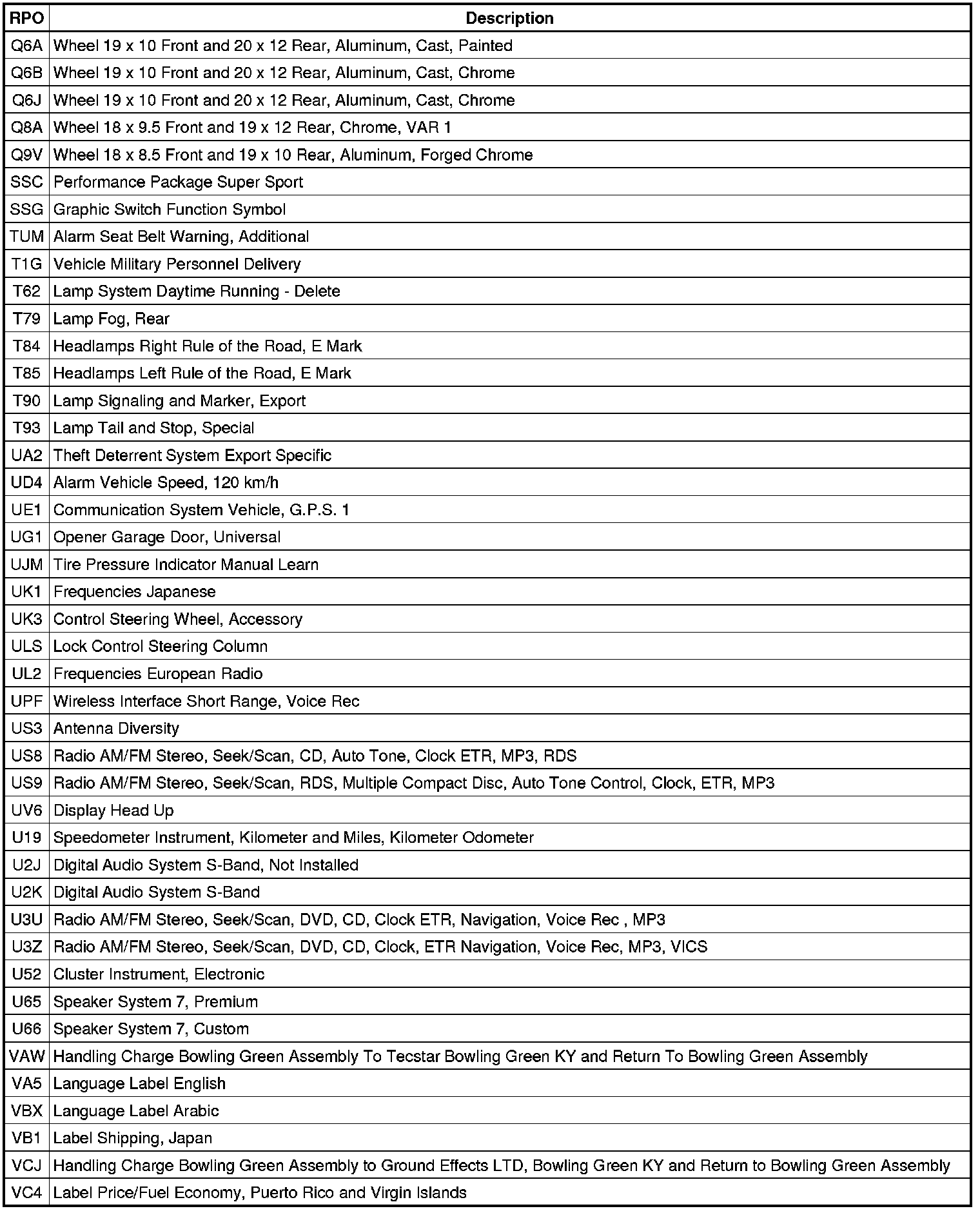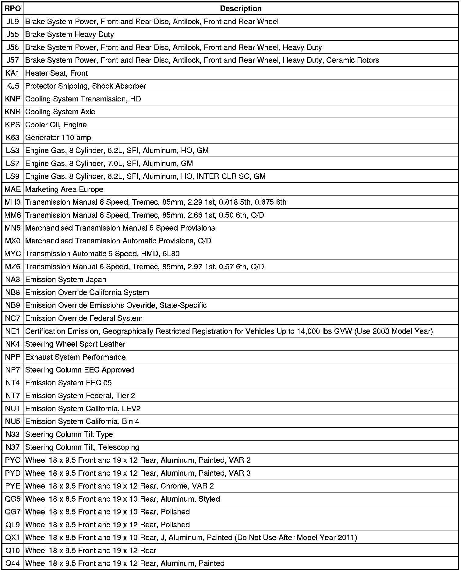 The following table provides the description of the Regular Production Option (RPO) codes that are available on the vehicle. The vehicle's RPO list is printed on the Service Parts Identification Label.
