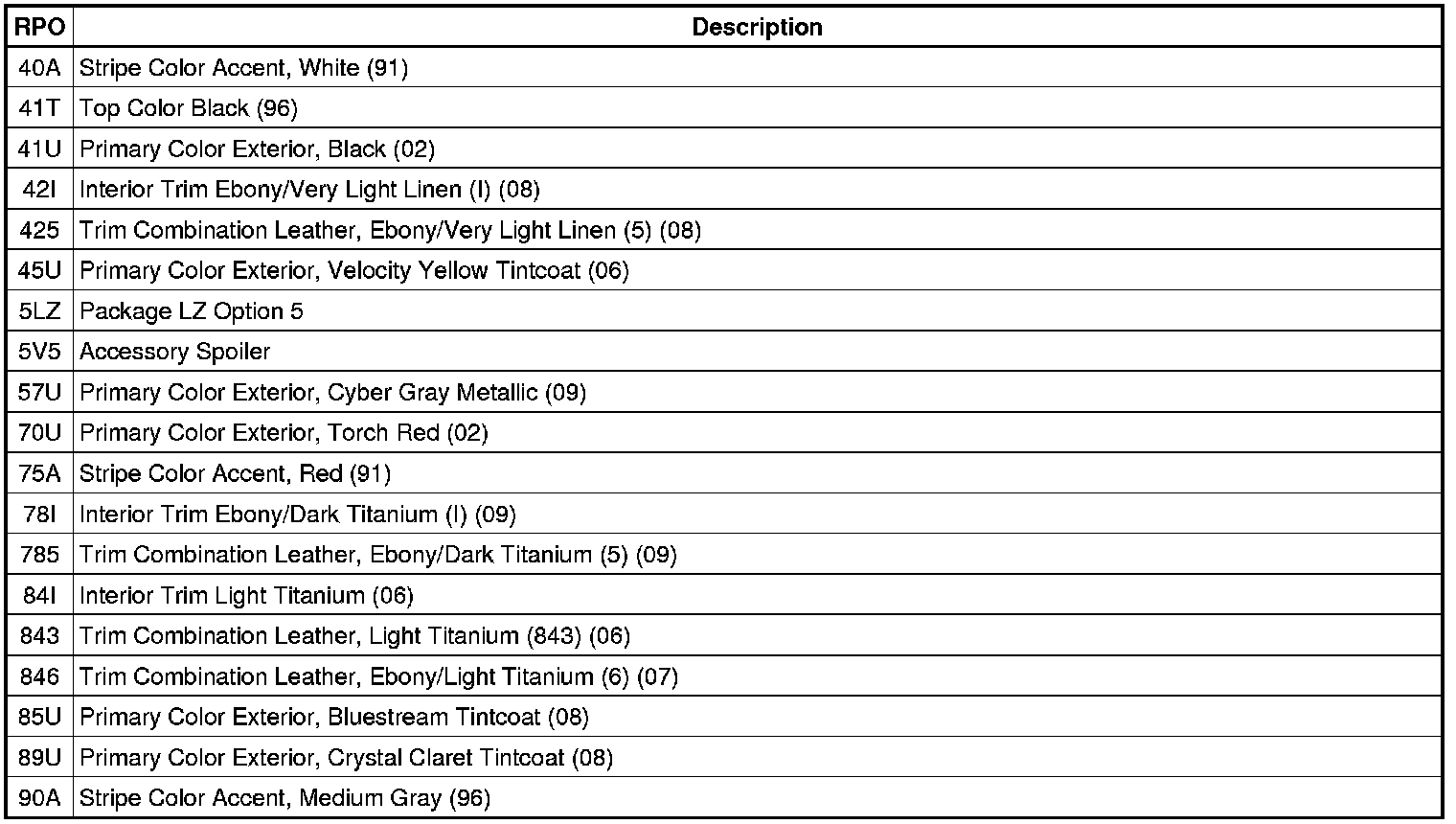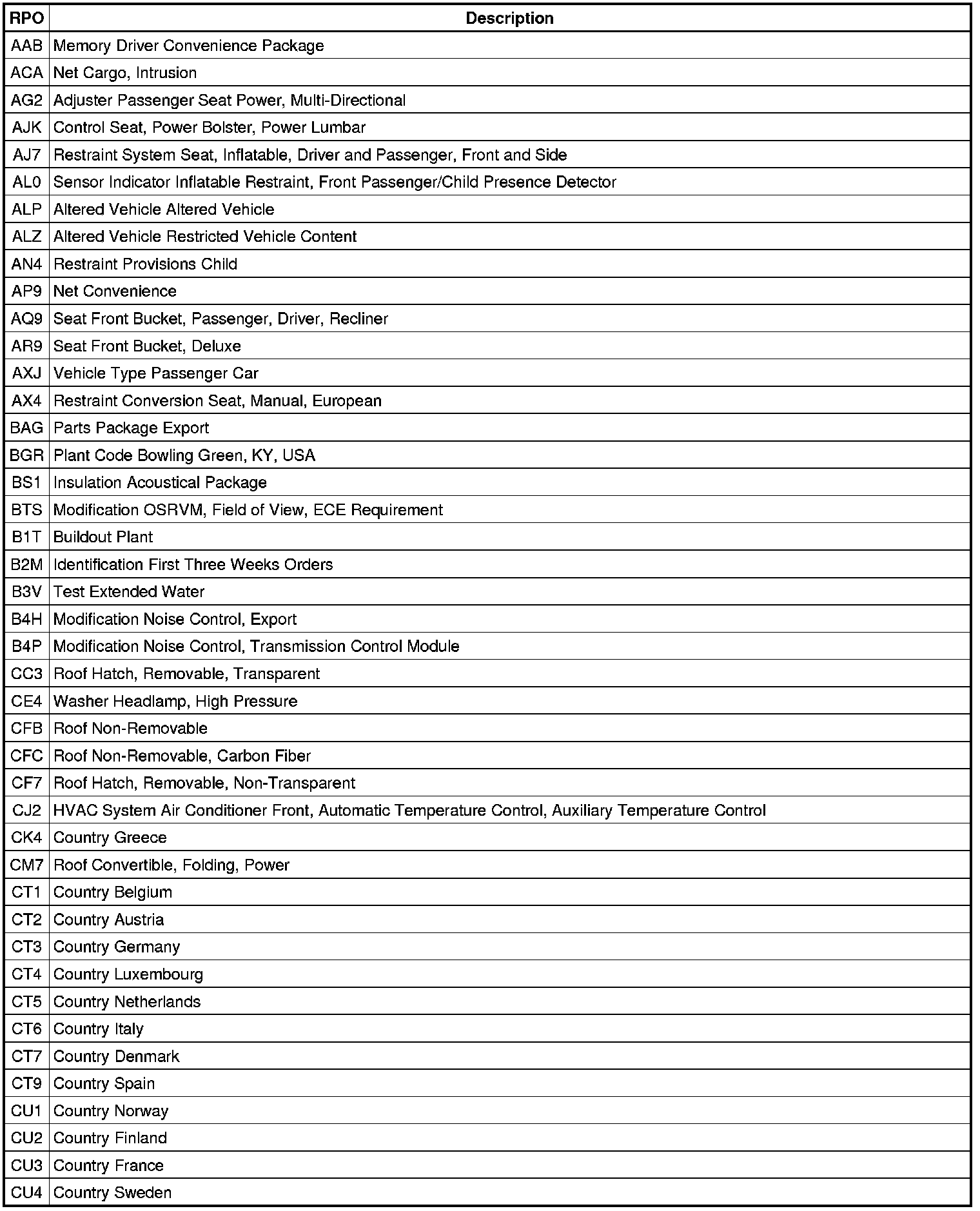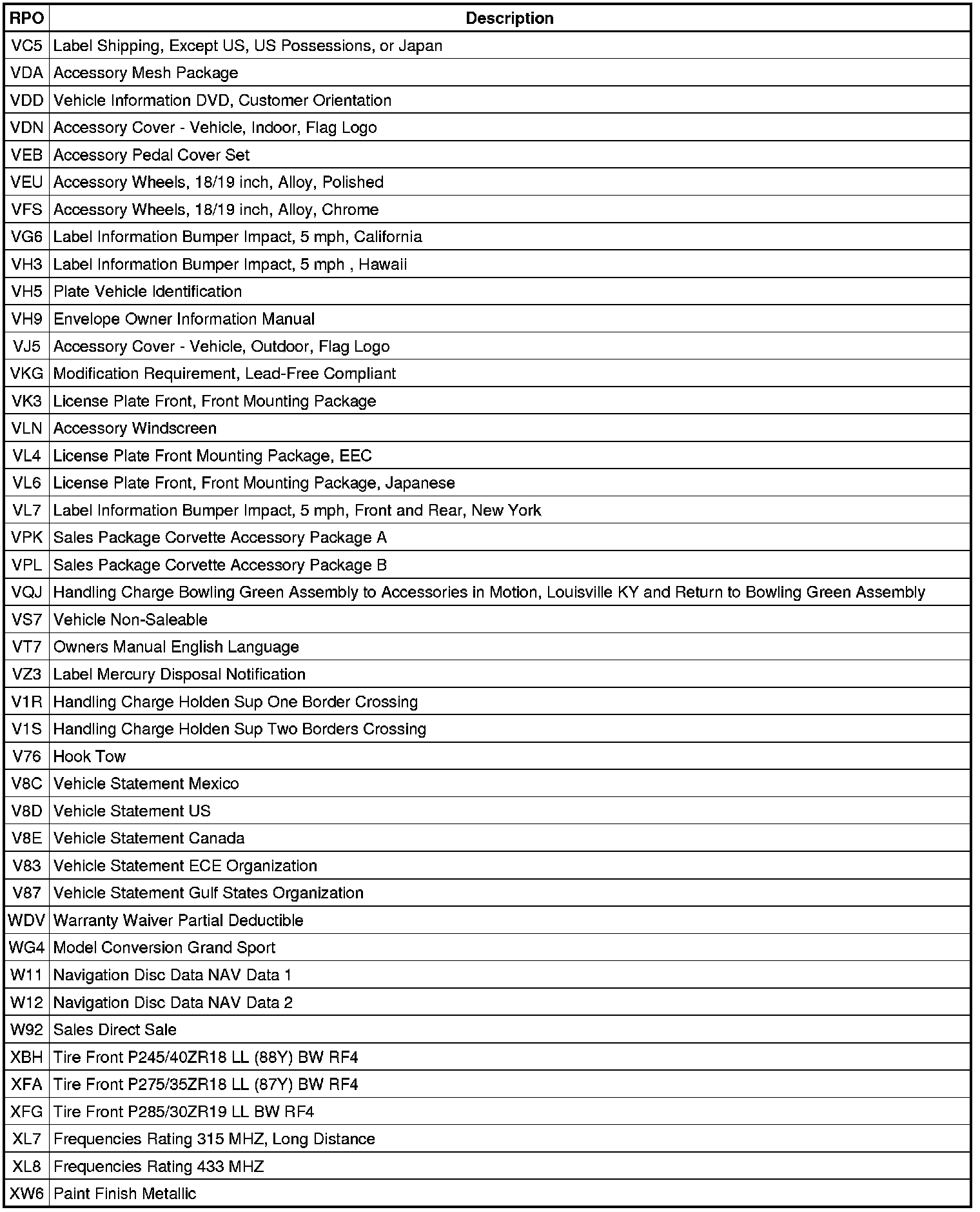 The following table provides the description of the Regular Production Option (RPO) codes that are available on the vehicle. The vehicle's RPO list is printed on the Service Parts Identification Label.