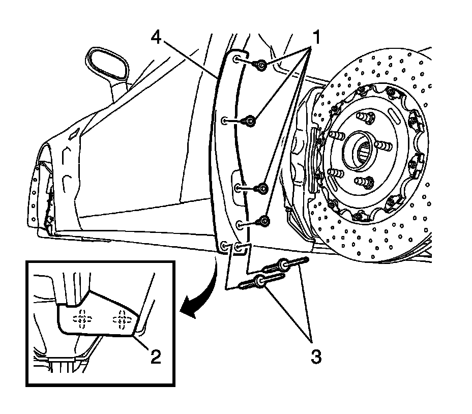 7. Using a drill motor and a 5.5 mm (7/32 in) drill bit, drill the center of the two rear wheel opening flare rivets (3).