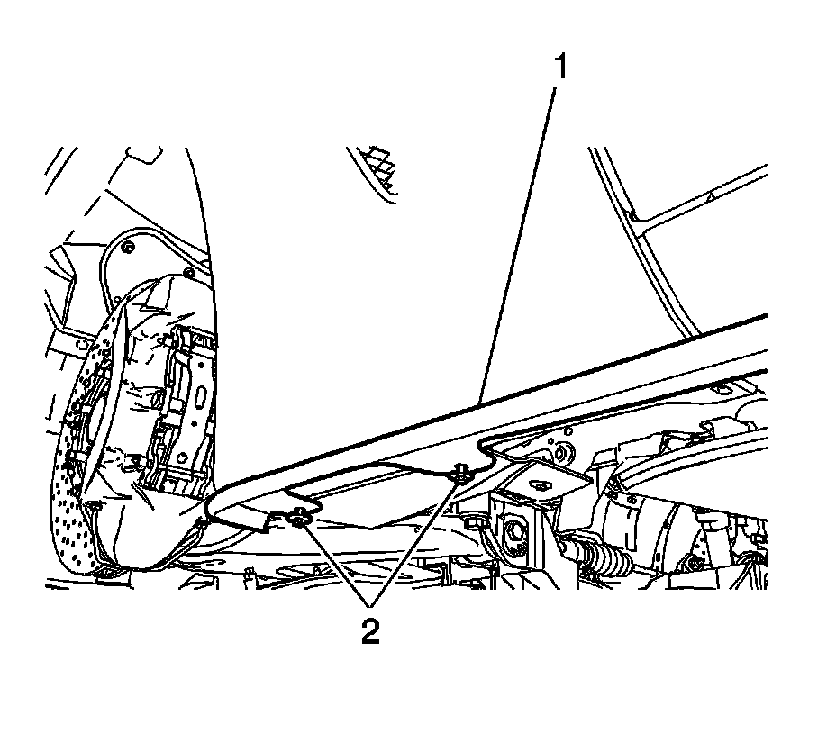 2. Loosely install the two front wheelhouse liner rear screws (2) through the lower rear molding (1).