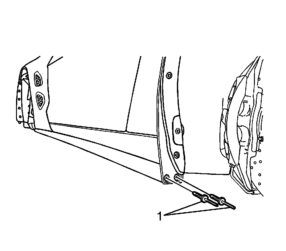 1. Position the new body side lower rear molding (1) to the vehicle.