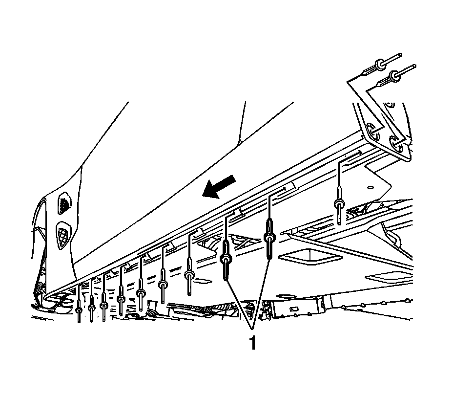 4. Beginning at the rear of the lower molding, install the ten rivets (1), holding firmly the lower body side molding to the contour of the lower body panel working forward.