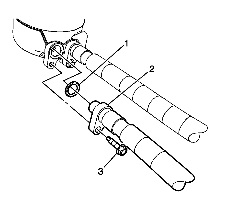 4. Using a new oil seal (1), install the oil inlet hose (2) and bolt (3) to the oil tank. Tighten the inlet hose to oil tank bolt to 22 Nm (16 lb ft).