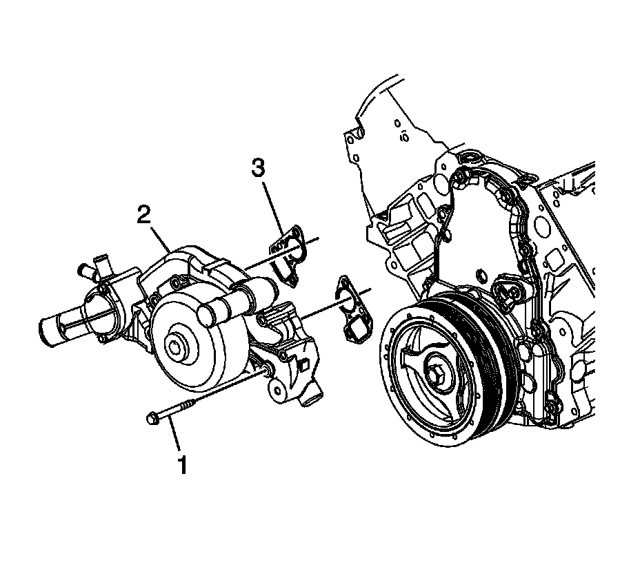 1. Install the water pump (2) and NEW gaskets (3).