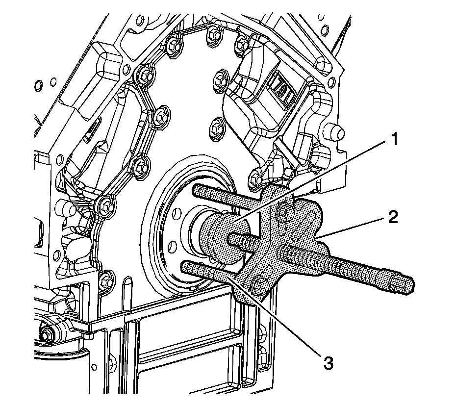 2. Assemble the J 24420-C - crankshaft balancer puller (2), the J 45949 - pilot bearing and flywheel locator installer (1), and the DT-49805 - bolts (3) to the rear of the crankshaft.