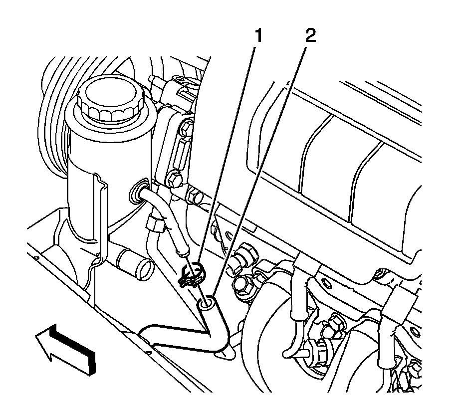 8. Connect the power steering cooler hose (2) to the remote power steering fluid reservoir and release the clamp.