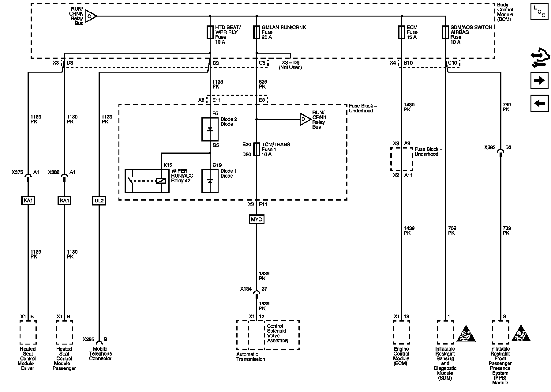 ECM, GMLAN RUN/CRNK, HTD SEAT/WPR RLY, SDM/AOS SWTCH AIRBAG, and TCM/TRANS Fuses