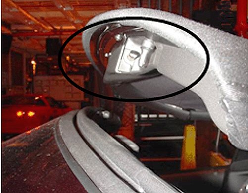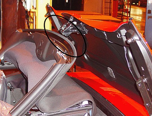 Some customers may comment that when opening/closing the folding top, the tonneau latch (circled above) is hitting the front edge of folding top #1 bow.
