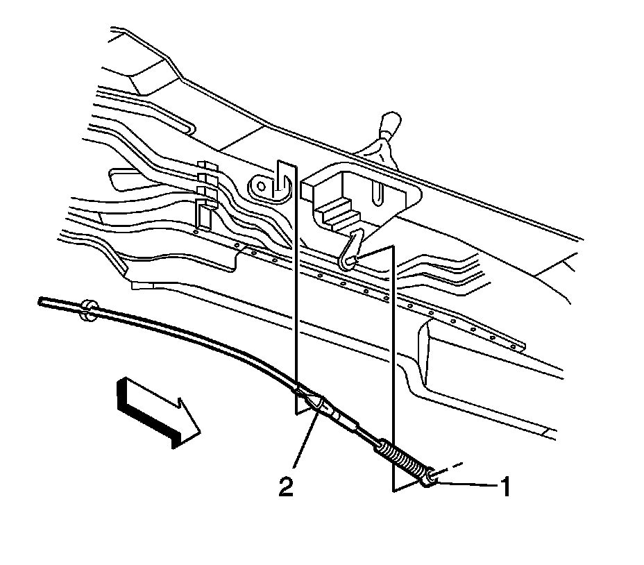 6. Remove the shift control cable (2) from the driveline tunnel bracket.