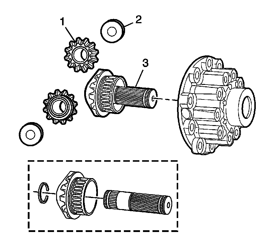 * Excessive wear or scoring in the side gear (1) pin bores