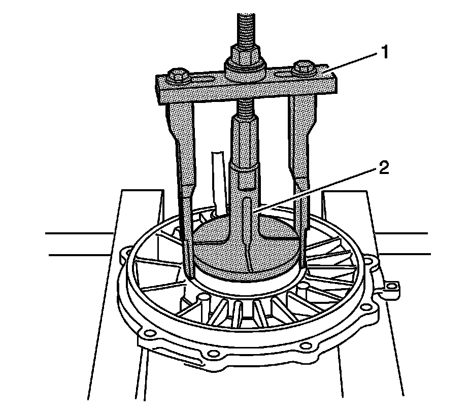 10. Place the J 45124 (1) over the DT-47596 (2). Adjust the legs for the best fit. Install the supplied bolt, nut thrust and washer. Hold the bolt and tighten the nut to remove the bearing cup and shim.