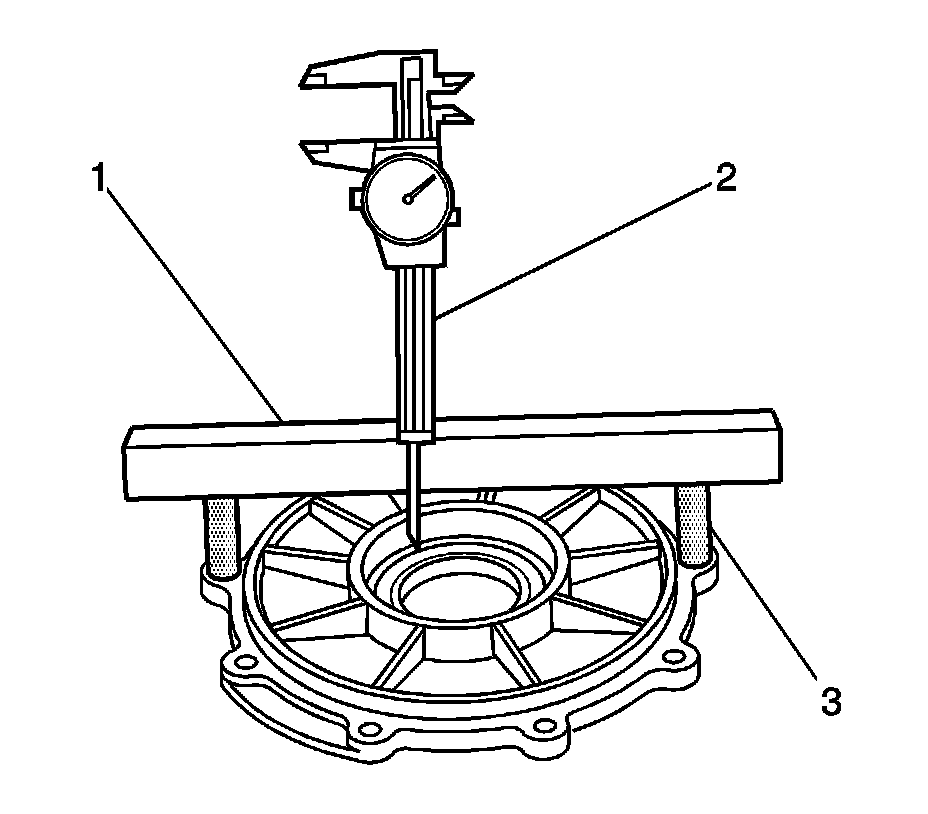 12. Use a vernier caliper (2) and a straight edge (1), in order to measure the NEW differential cover bore dimension. Record the measurement as value A.