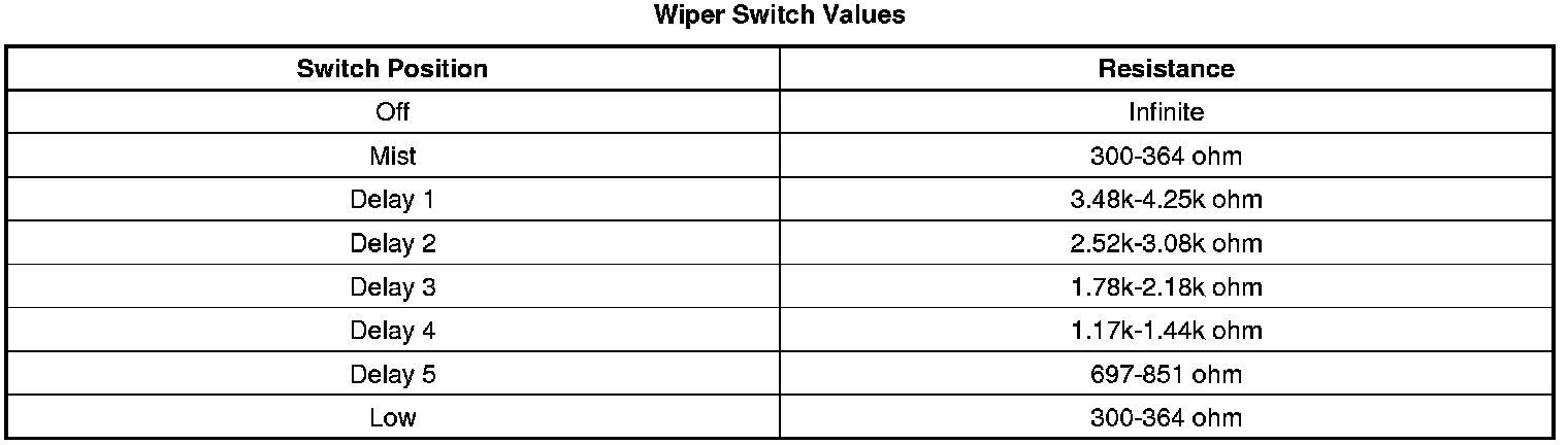2. Test the resistance between terminals H and L. Rotate the wiper switch and compare the resistance readings to the values in the Windshield Wiper Switch Values table below for MIST, each DELAY and LOW speed.