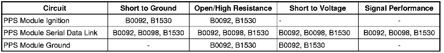 DTC B0092 is an indication that the SDM has received an incorrect PPS verification ID or has lost communication with the PPS. The SDM will continue to request the verification ID from the PPS for 5 seconds. If the SDM does not receive the correct verification ID from the PPS within 5 seconds, the SDM will set the DTC as current, illuminate the AIR BAG indicator, and disable the I/P module deployment loop.
