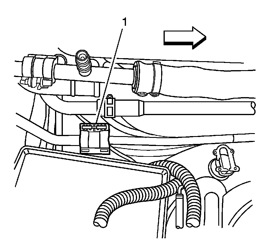 3. Disconnect and remove the A/C tube connector (1) at the evaporator rear line assembly. Refer to Air Conditioning Line/Tube Connector Removal/Replacement (Air Conditioning Line/Tube Connector Removal/Replacement).