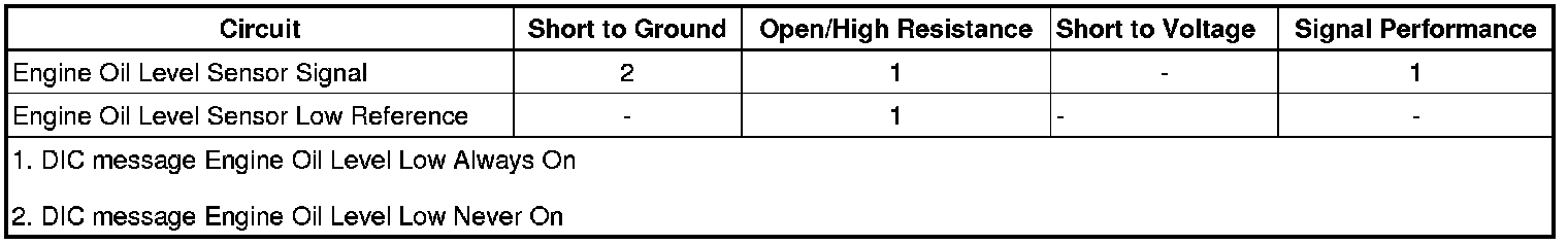 The engine oil level sensor/switch is a normally-closed with proper engine oil level. The switch opens when the engine oil level drops below a calibrated level. The engine control module (ECM) monitors the engine oil level signal circuit when the ignition is ON, and the engine is OFF. With the switch in the closed position, the ECM detects a low voltage signal circuit. With the switch in the open position, the ECM detects a high voltage on the signal circuit. When high voltage is detected on the signal circuit, the ECM will send a serial data message to the instrument panel cluster (IPC) and a message is displayed on the driver information center (DIC).