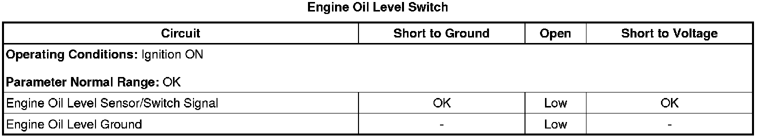 The oil level low message is displayed only after the ECM detects a high voltage on the signal circuit, followed by an ignition OFF event greater than 30 minutes, followed again by the detection of high voltage on the signal circuit when the ignition is turned to the ON position.