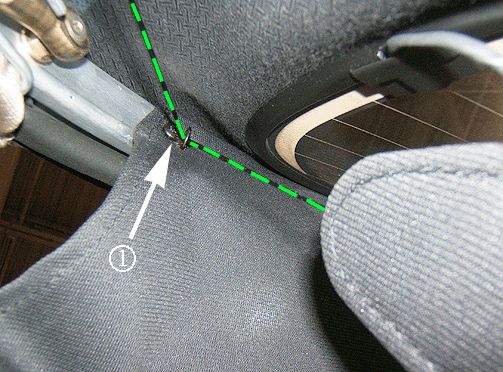 13. Remove the screw (1) holding the end eyelet of the short headliner string to the inboard side of the side rail links (shown in blue above), from the right and left side.