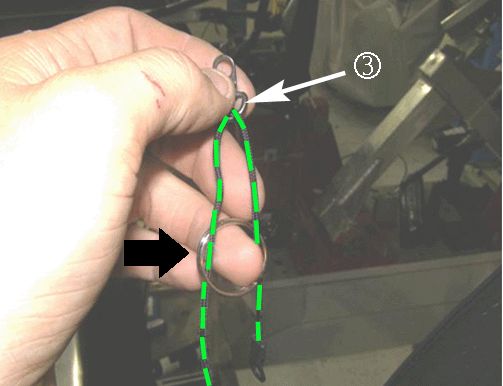For illustration purposes, the third D-ring and metal key ring are shown outside the vehicle. When actually doing this step, the end eyelet (hanging down in the above graphic) and the second D-ring will already be attached.