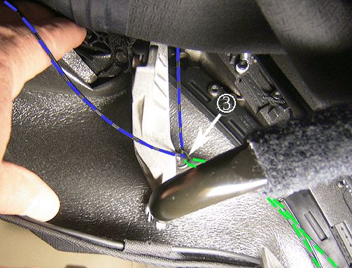 Prior to securing the rivet, ensure that the short headliner string (shown in blue above) is routed through the P-clip and that the D-ring and P-clip are in the proper orientation. The P-clip should point to the outside of the vehicle and the D-ring should point forward.
