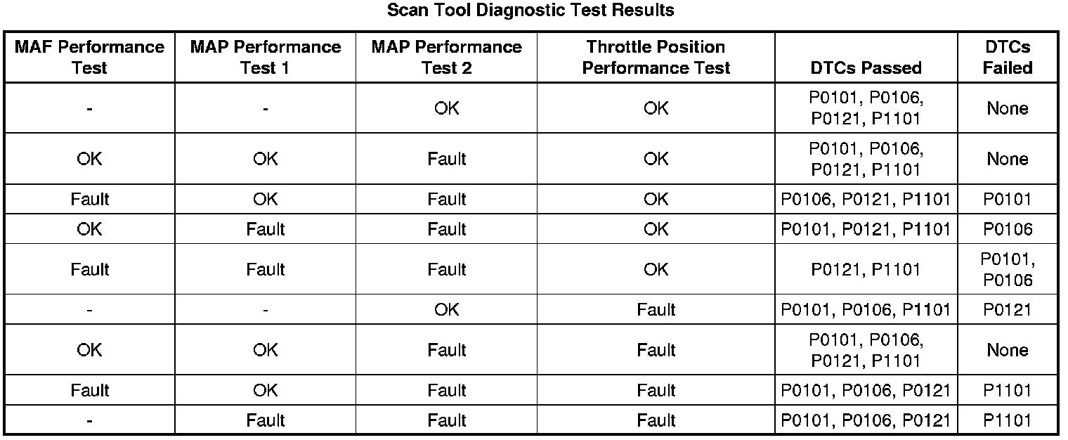 The estimates of MAF and MAP obtained from this system of models and calculations are then compared to the actual measured values from the MAF, MAP, and the throttle position sensors and to each other to determine the appropriate DTC to fail. The following table illustrates the possible failure combinations and the resulting DTC or DTCs.