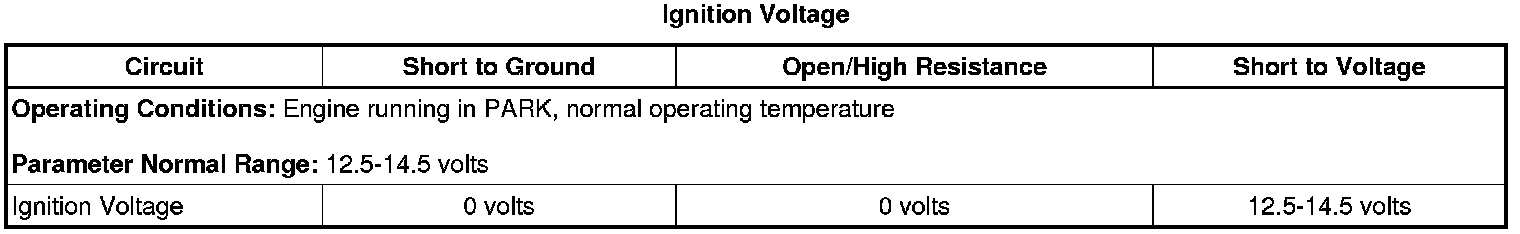 3. Engine running, accessories OFF, observe the Ignition Voltage parameter on the scan tool. The Ignition Voltage should be between 12.0 and 14.5 volts.