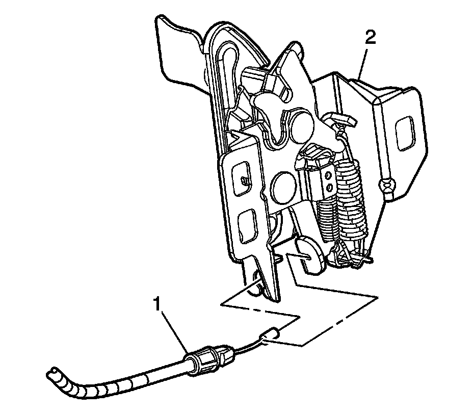 9. Install the hood release cable (1) from the hood latch (2).