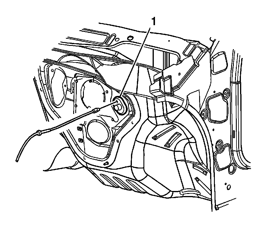 7. Remove the hood release cable grommet (1) from the dash panel.