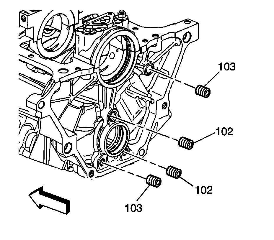15. Install the rear oil gallery plugs (102) and tighten to 33 Nm (24 lb ft).